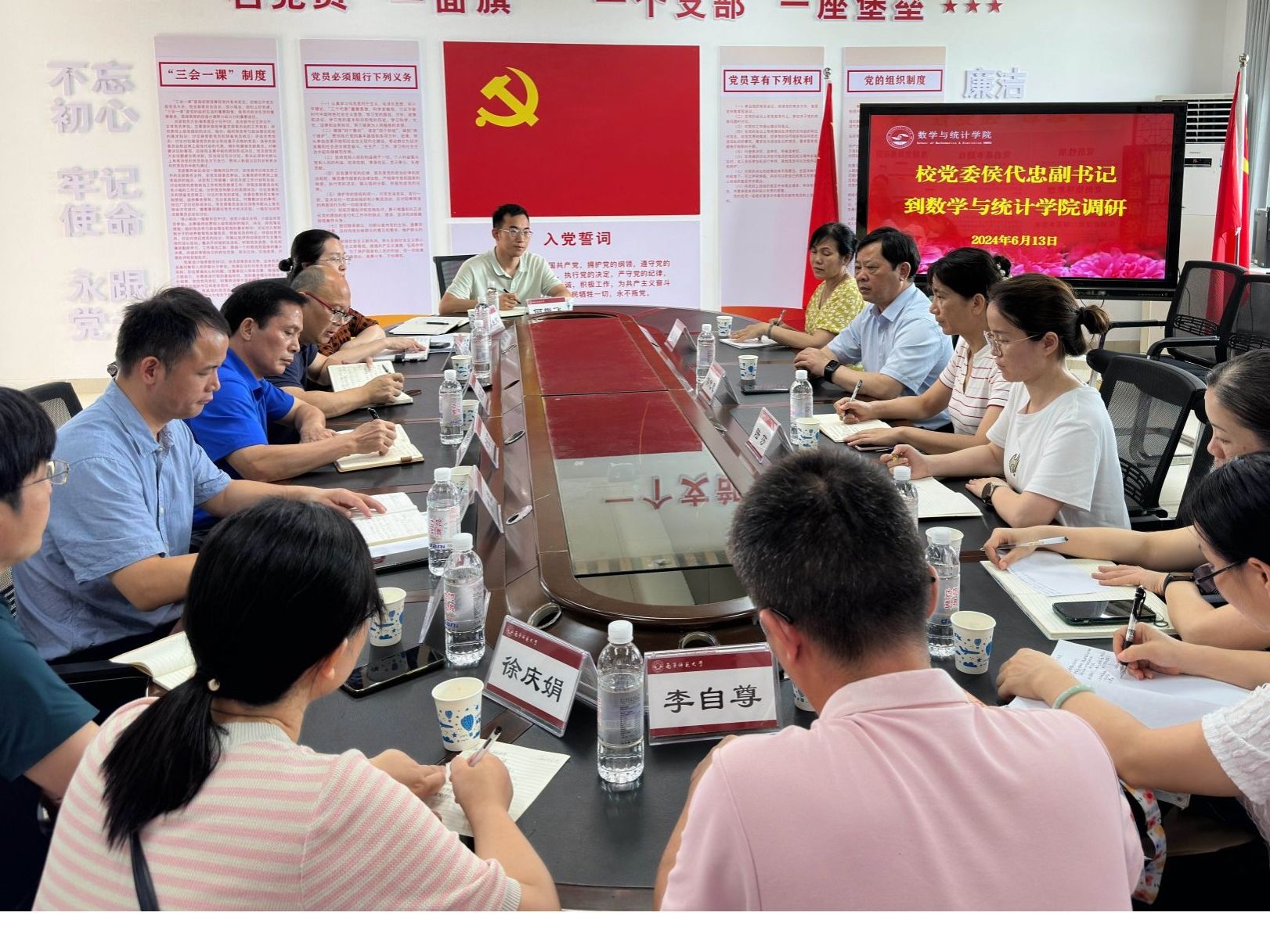 调研座谈会上,侯代忠认真听取了该院工作汇报,他对该院在师资队伍建设、学科专业建设、科研教学、学生工作等方面取得的成效给予肯定。针对该院下一步发展,侯代忠提出五点要求:一是坚持党建引领,持续发挥“党建+”作用,以高质量党建促进教育高质量发展,推进党建与事业发展“一融双高”,深入探索推动党建与事业发展深度融合,以高质量党建助推学院高质量发展的方法路径。坚持党建工作和业务工作一起谋划、一起部署、一起落实、一起检查。要深刻认识开展党纪学习教育的重要意义,准确把握党纪学习教育目标要求,坚持更高标准、更严要求,扎实开展党纪学习教育。二是要以本科教育教学审核评估为契机,坚持立德树人根本任务,落实“以本为本”“四个回归”,着力构建“三全育人”的工作格局和“五育并举”的育人体系,充分挖掘学科特色,加大对教师教学能力提升培训力度。三是要牢牢抓住发展机遇,用好广西数学应用中心(南宁师范大学)、广西应用数学院士工作站、广西数学会数学教育分会平台,做好顶层设计,总结经验、尽早谋划、细化分工、拓展思路,为提升广西数学教育研究水平,推动数学教育改革,提高数学人才培养质量发挥重要作用。不断推进数学与工程应用、产业化的对接融通,加强校企合作,全面提升数学支撑广西创新驱动发展战略深入实施及经济社会高质量发展的能力和水平。四是要以下一轮博士点建设申报为目标,对照申报基本条件和要求,提早布局,列出任务清单,明确目标,补齐短板。五是要把日常工作做实,专任教师、行政人员要各司其职,共同发力,践行管理育人、服务育人理念,加强教学管理,加强对学生的思想引领,抓好学生基础知识和基本能力的培养,打牢学生成长成才的基础。