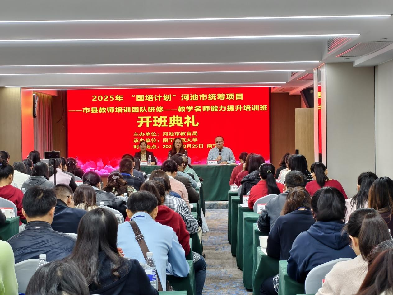 2025年10月25日,2025年“国培计划”河池市统筹项目——教学名师能力提升培训班在南宁师范大学正式开班。本次培训为期8天,将持续至11月1日,旨在进一步提升河池市中小学教学名师的专业素养与教学能力,来自河池市各县区的近百名中小学教学名师共同参与此次培训。