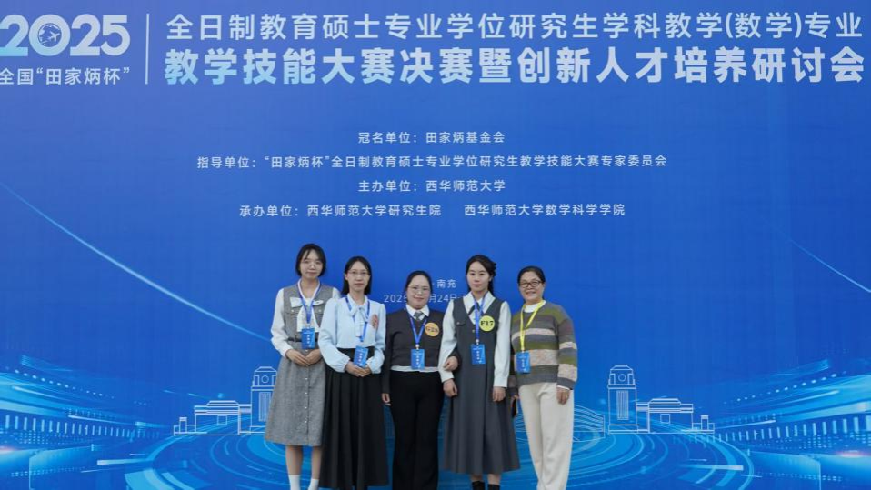 近日,2025年全国“田家炳杯”全日制教育硕士专业学位研究生学科教学(数学)专业教学技能大赛决赛暨创新人才培养研讨会圆满落幕。必威西汉姆联官网研究生肖越荣获二等奖,赵月、张晶荣获三等奖,覃珊珊荣获优秀教学设计奖,韦宏荣获优秀指导教师奖。