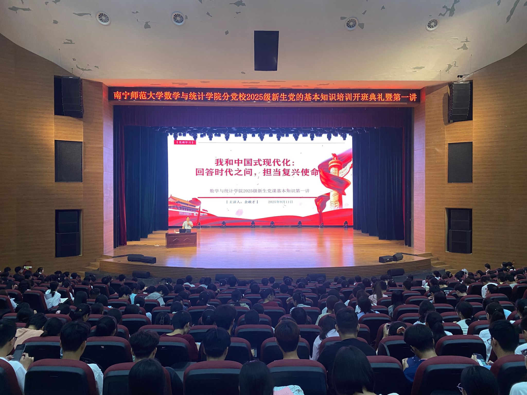 为进一步宣讲中国共产党领导下的中国式现代化进程与学生自身成长的关系,必威西汉姆联官网分党校于2025年9月11日在千人演播厅进行了新生党的基本知识培训开班典礼暨党课第一讲。专题党课由学院党委书记余敢才主讲,全体新生共同参与此次培训。