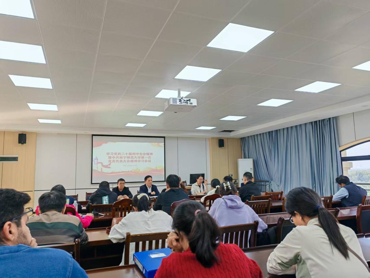 接着黄在堂院长引领大家学习南宁师范大学第一次党代会精神。他指出,此次党代会是在全面贯彻党的二十大和二十届四中全会精神、深入贯彻落实习近平总书记关于广西工作重要论述、全校师生聚力建设高水平师范大学的关键时期召开的一次重要会议。会议总结了学校上次党代会以来取得的成绩,深刻分析了世界面临新变局、教育面临新布局、广西面临新格局、学校面临新开局,明确提出“1395总体发展战略”,并把其作为未来五年乃至更长时期学校事业改革发展的基本遵循。他希望全体教职工以党的二十届四中全会精神为指导,紧紧围绕学校党委制定的“1395总体发展战略”,结合学院实际,凝心聚力、扎实推动学院的高质量发展。