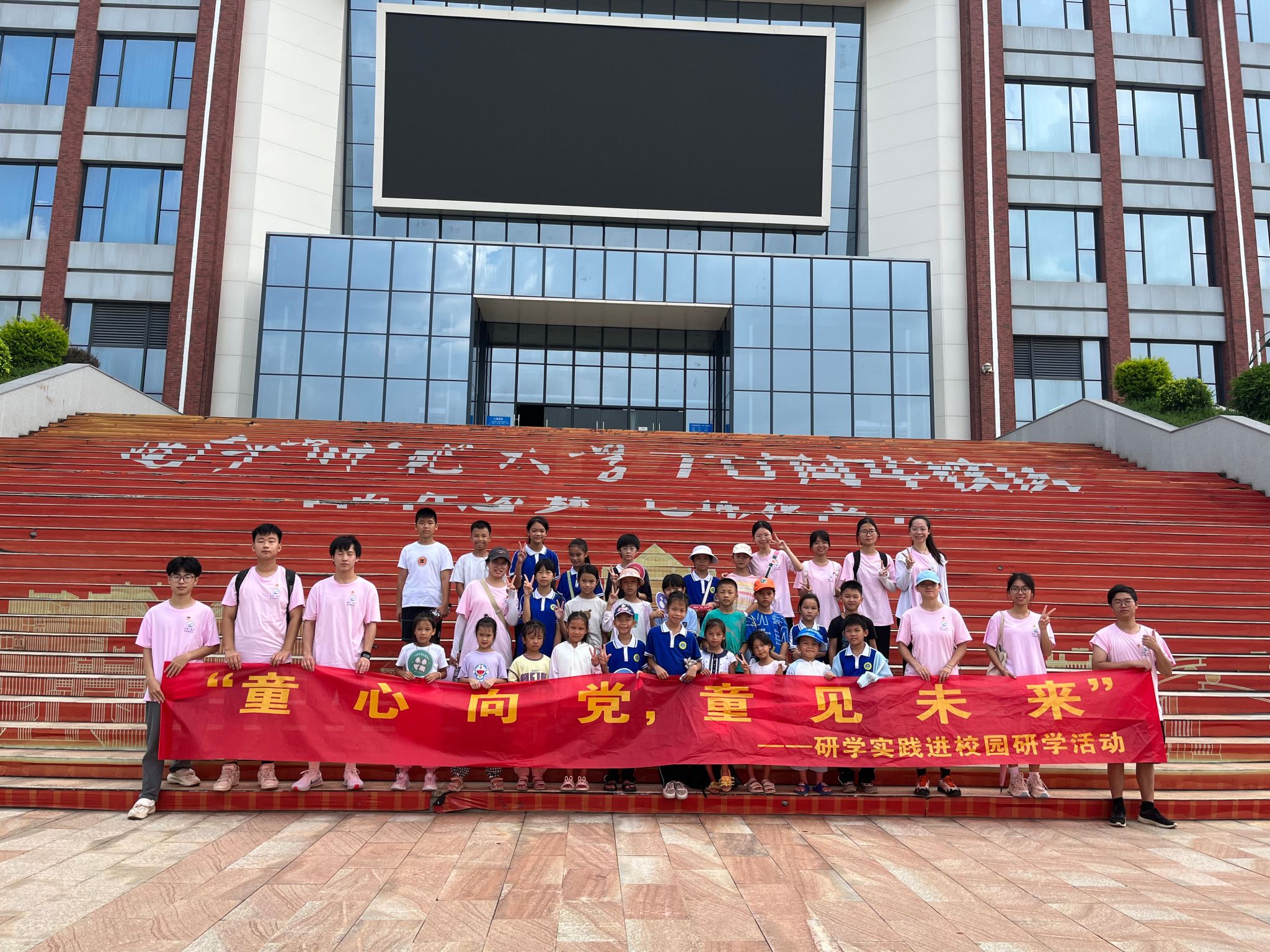 为积极响应国家“三下乡”社会实践活动的号召,在学校团委、学院党委的精心指导下,在马头镇人民政府和马头镇中心学校的鼎力支持下,南宁师范大学必威西汉姆联官网“澎湃·朋π”实践服务队来到了马头镇开展为期7天的暑期“三下乡”社会活动。7月13日,该学院实践服务队组织学员们到”家门口的大学”——南宁师范大学武鸣校区开展主题为“童心向党,童见未来”的研学活动。此次研学活动的学员由马头镇25名小学生组成。