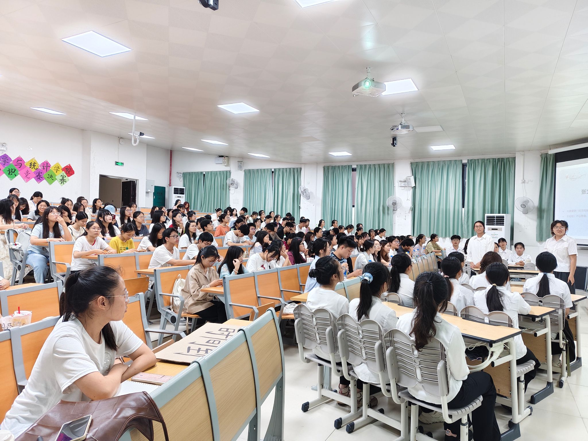 比赛环节紧张而激烈,共分为六个正式比赛环节和观众答题福利环节。第一环节:“破釜沉舟,捷足先登”个人必答题中,选手们依次作答,展现了其扎实的党团知识基础;第二环节:“条分缕析,奋进有为”判断题,各队代表在60秒内快速判断,体现了选手们对知识的熟练掌握;第三环节:“踏歌逐影,乐音溯源”,通过经典电影片段、红色歌曲和图片等形式出题,选手们积极抢答,在紧张刺激的氛围中展现了对红色文化的深刻了解;第四环节:“当机立断,敢做敢为”团队抢答题,充分考验了团队的协作能力与知识储备;第五环节:“蓄势待发,当机立断”团队风险题,各队根据自身情况选择不同分值题目,展现了策略智慧与决断勇气。第六环节:“巅峰对决,谁与争锋”开放论述题,选手们结合所学阐述见解,展现了理论深度与思辨能力。观众答题环节反响热烈,现场观众踊跃参与,在互动答题中进一步学习了党团知识。
