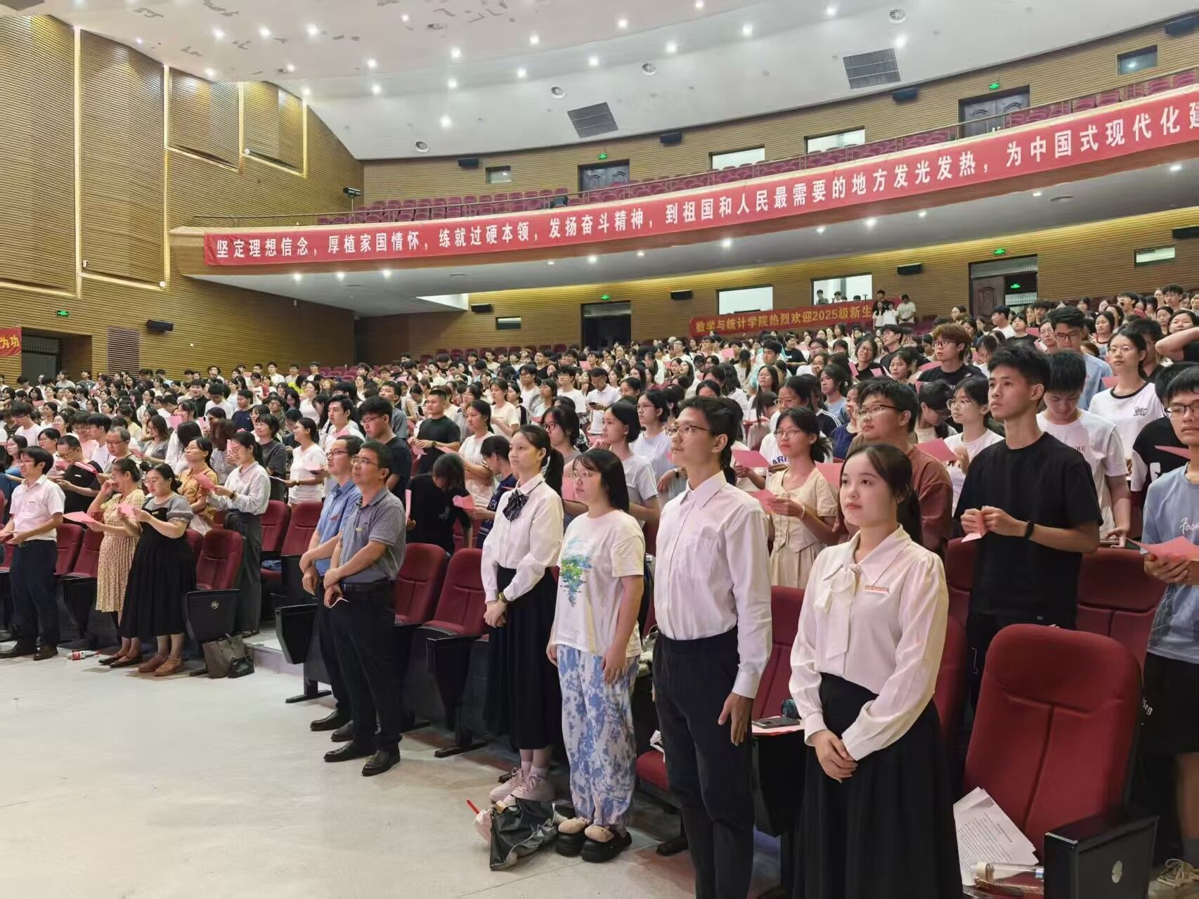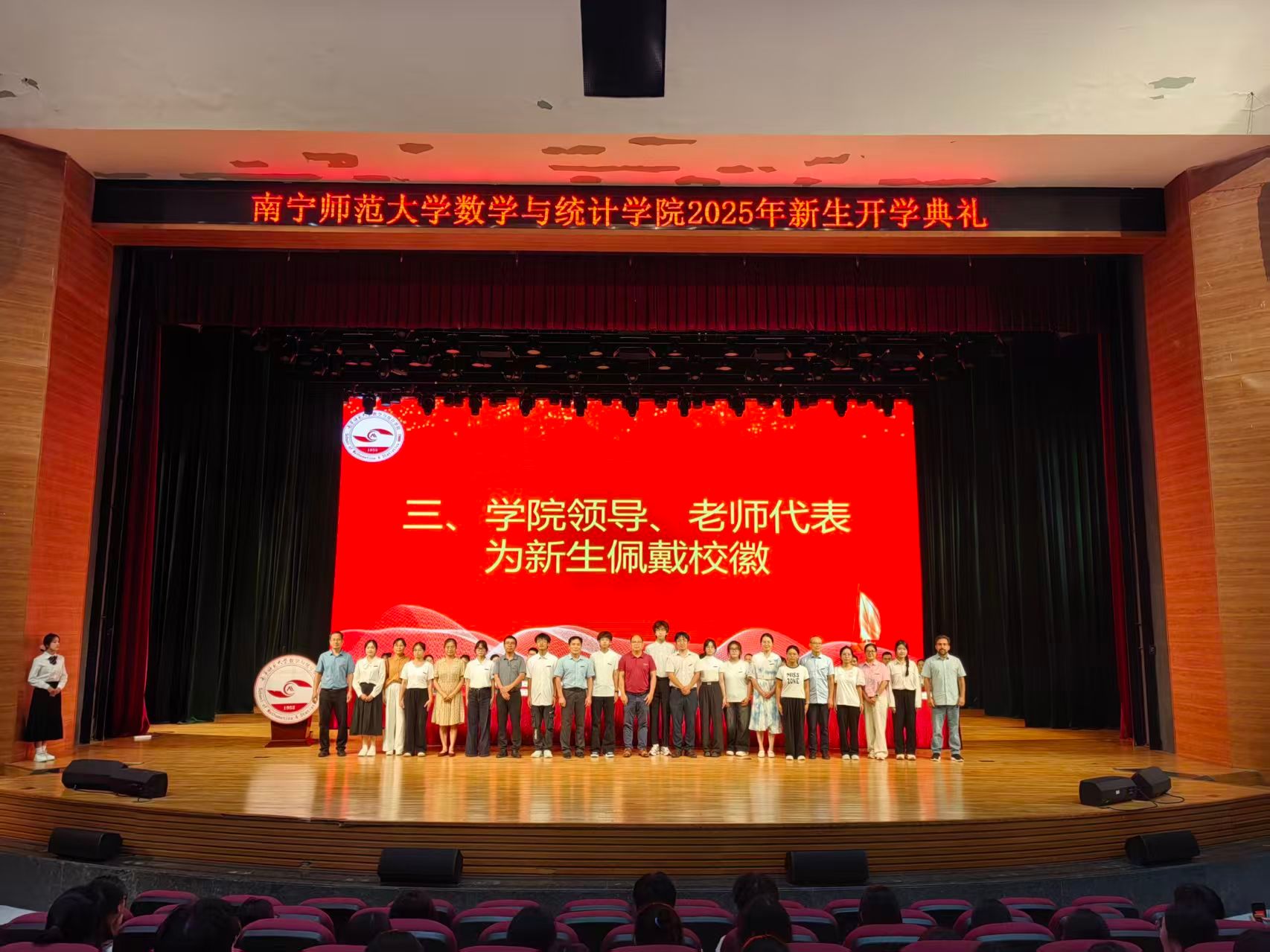 典礼在庄严的国歌声中拉开序幕。随后,学院领导、老师代表共同为新生代表佩戴校徽。学生代表们围绕个人品格的培养、学业研究的科学方法等方面与同学们进行分享,充分展现了数统学子的青春担当与蓬勃力量。教师代表刘艳萍结合教学实践,分享学术探索的方法与态度;研究生导师代表麦雄发聚焦科研初心,为新生传递学术经验与奋斗方向。现场播放的学校宣传片,让新生直观感受学校办学实力、硬件设施,更沉浸式领略了校园活力与人文温度。最后,黄在堂院长回顾学校发展历程与办学理念,鼓励新生深耕学术,以干劲投身实践,以坚韧直面挑战,在突破自我中成长。伴随着全体师生合唱的悠扬校歌,本次开学典礼圆满落幕。