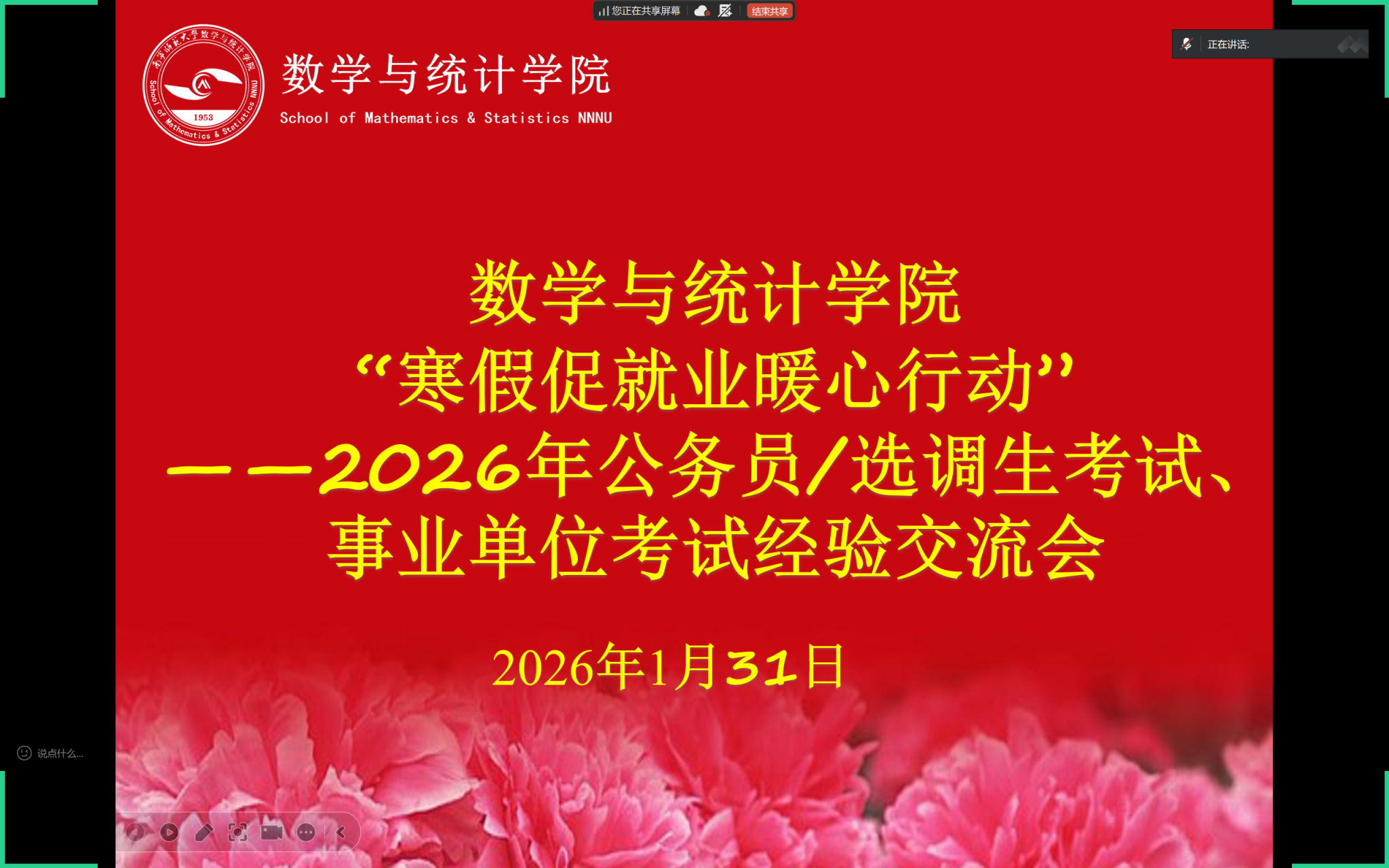 为助力备考学子调整心态、从容应考,同时强化诚信考试意识,必威西汉姆联官网于1月31日晚上19:30于腾讯会议开展“寒假促就业暖心行动”——2026年公务员/选调生考试、事业单位考试经验交流会。学院团委书记梁卡霖老师、选调生庞淼学长、公务员张廷强、黄德鸿学长以及在任教师李雨珊学姐出席活动。