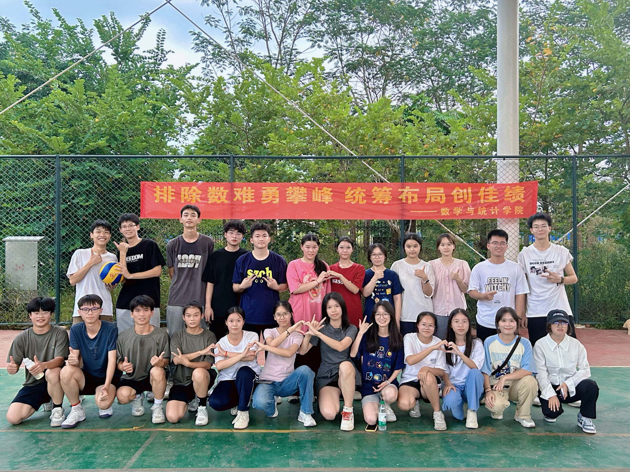 在比赛过程中,裁判员们专业规范、认真负责地向参赛人员认真细致地解释比赛规则,说明比赛的注意事项。参赛队员们胸有成竹、信心满满地走入比赛场地,每个人眼里都充满了坚定与自信,大家奋力拼搏,每一次精彩的拦网、扣杀、扑救,都展现精湛的球技和默契的团队协作精神。同时,学院党委付进副书记和辅导员还共同观看了比赛决赛,为参赛队伍助力加油,各班也自发组成拉拉队给予了队员们极大的鼓舞和帮助。队员们在赛场上挥洒汗水、奋力拼搏,每一个传球都凝聚着智慧与团结,每一次接球都尽显他们青春的活力。整个赛场上充满呐喊、助威、喝彩、拼搏、活力。2024级数本7班获得第一名,2024级数本5班获得第二名。