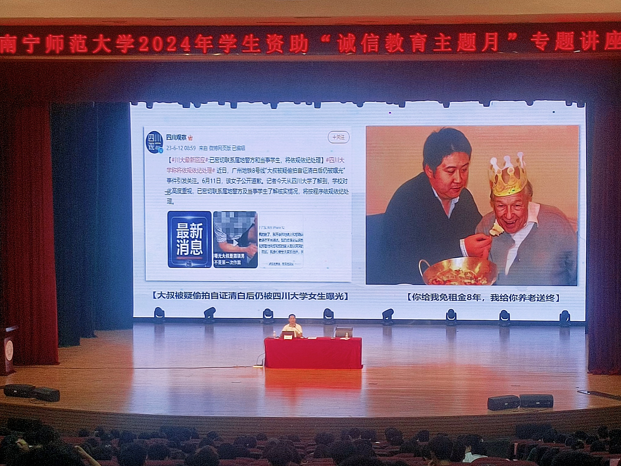 为进一步提高学生诚信意识,增强资助育人成效,6月25日下午,2024年全区高校学生资助“诚信教育主题月”专题讲座在武鸣校区音舞楼报告厅开展,必威西汉姆联官网组织100名学生参加此次讲座。本次讲座由我校政策法规与发展规划处邓军彪处长主讲。