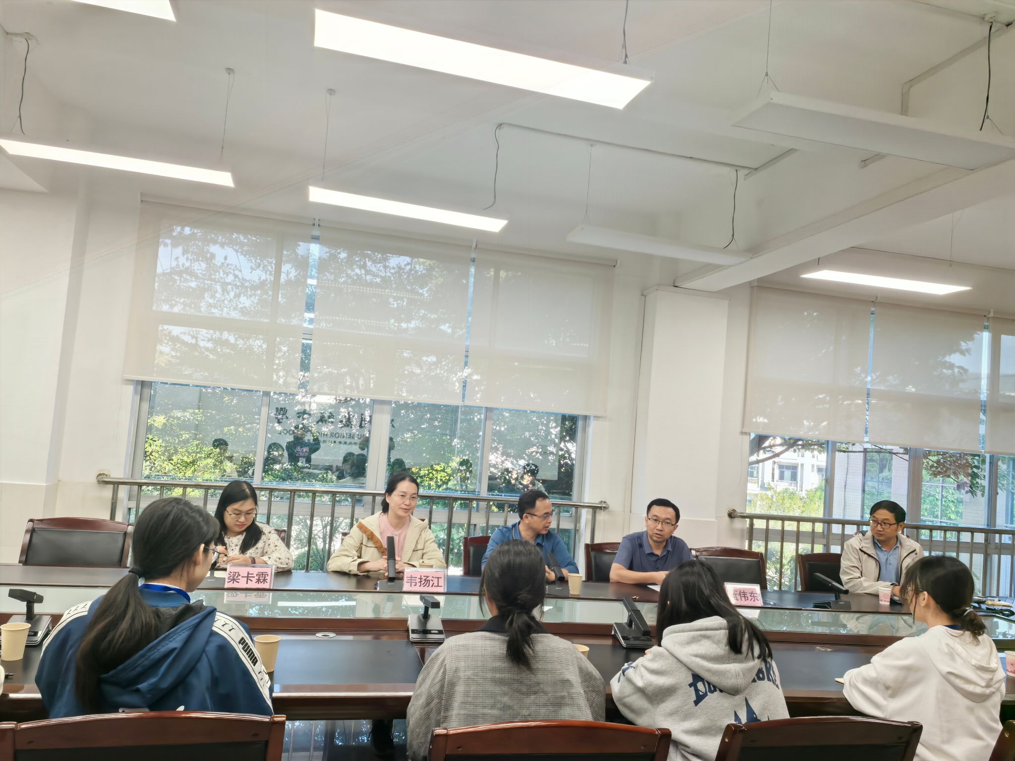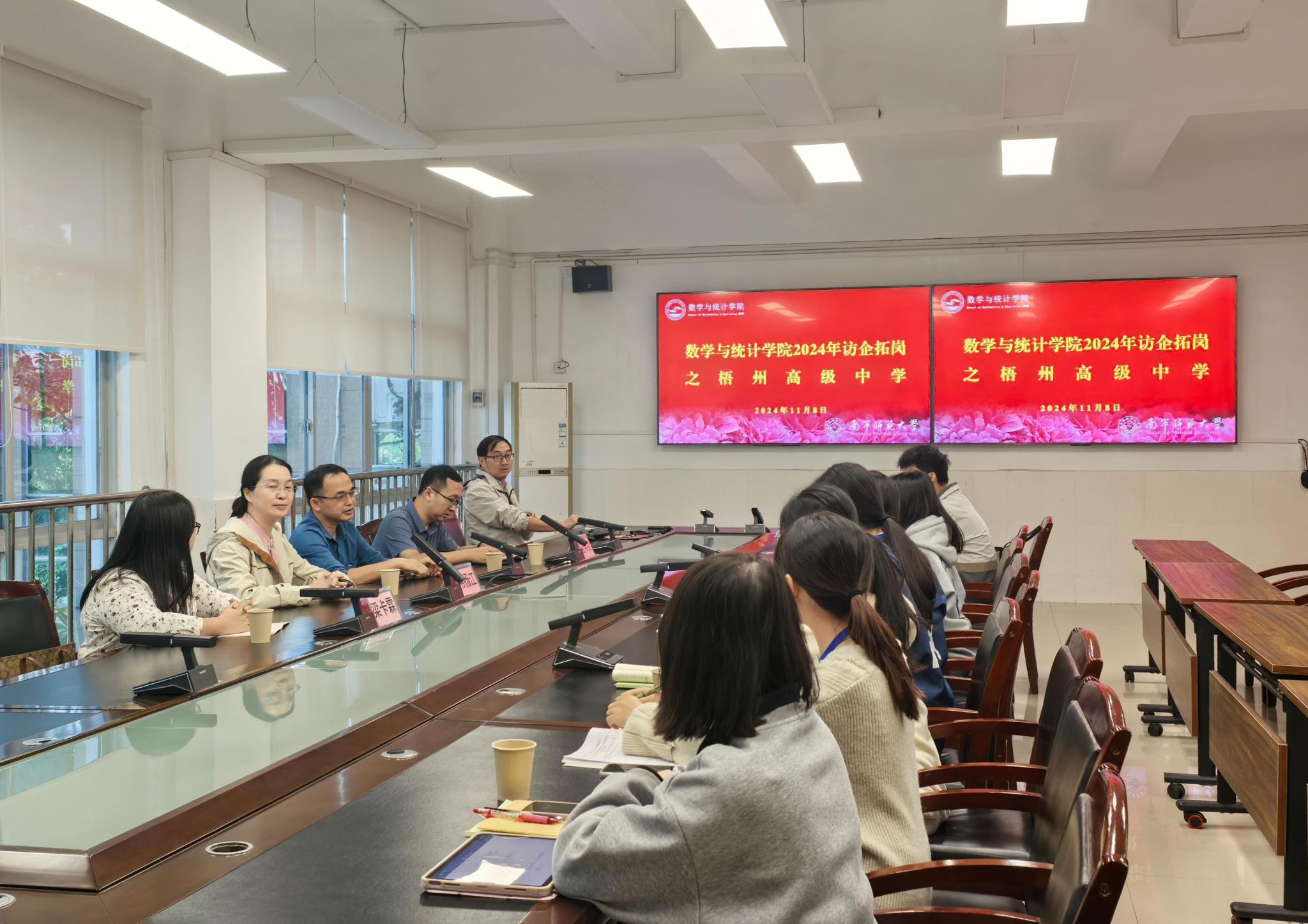 座谈会后,在梧州高级中学蓝副校长的陪同下,韦扬江副院长、梁卡霖老师以及2025届毕业生一行首先参观了高二数学组教师办公室、实习生备课室和教学示范基地,并观摩了实习生的教学公开课。至此,本次梧州高中实习中期检查暨访企拓岗活动顺利完成。