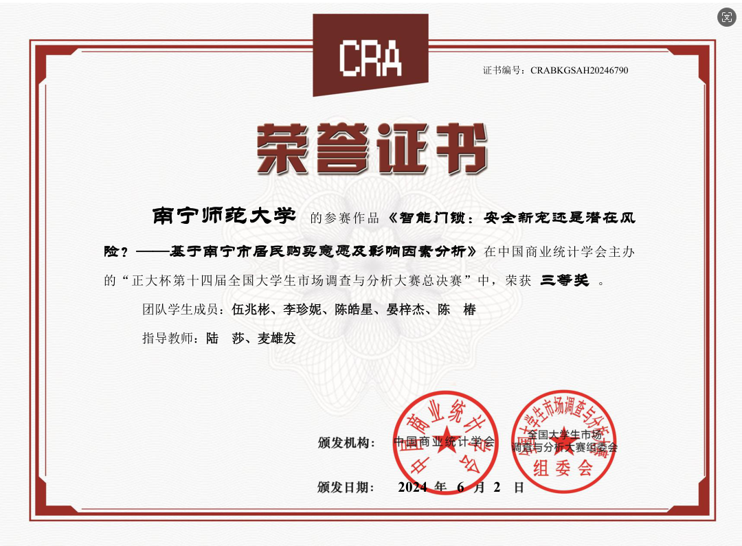 由中国商业统计学会、全国大学生市场调查与分析大赛组委会主办的第十四届全国大学生市场调查与分析大赛已圆满落下帷幕。本次大赛于 2023年9月启动,吸引了全国1063所高校,29.5万名大学生报名参赛,经过理论知识赛、校赛、省赛的层层选拔决出各奖项。在本次大赛中,我校学子积极参与,围绕社会和经济问题开展调查研究,通过精准定位以小见大,运用所学知识进行深入探讨和分析,给出有意义的结论和建议。我校参赛队共获得本科组国家三等奖1项、广西一等奖1项、二等奖9项和三等奖2项;研究生组获得国家三等奖1项、广西一等奖3项、三等奖3项。