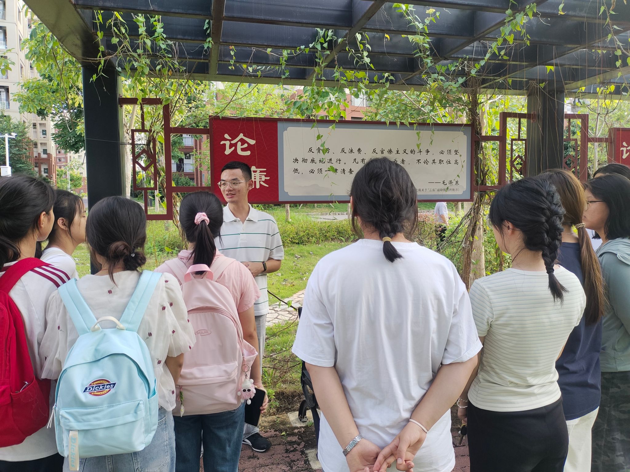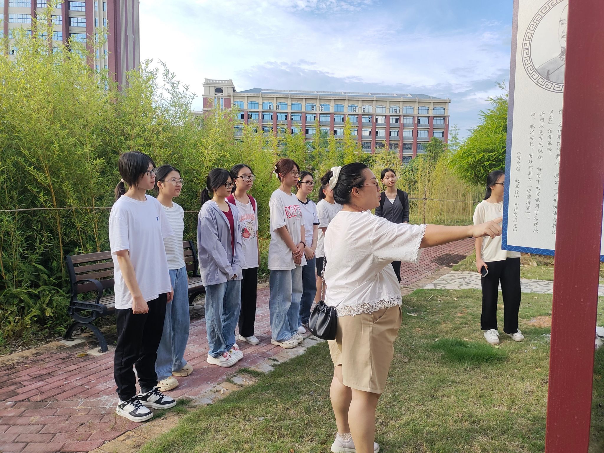 9月16日,学院党委副书记王卫彬,学院团委书记梁卡霖,辅导员卢若楷、滕容梅、方安琪带领学院学生代表参观清风竹苑廉洁文化园。参观过程中,梁卡霖老师对同学们说到:“希望大家通过学习在‘论廉、画廉、咏廉’等板块上呈现的廉洁论述,去直观感受到廉洁并非抽象概念,而是融入日常言行的坚定选择。”卢若楷老师向同学们介绍道:廉洁文化是中华优秀传统文化的重要组成部分,对青年成长至关重要,同学们应主动传承和弘扬廉洁文化,将廉洁精神内化于心,外化于行。