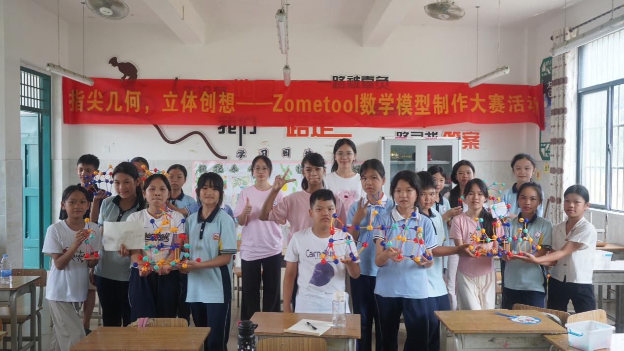 实践服务队支教组队员在老师的指导下以“数学+”为特色制定了七彩课堂教学计划:在第一节课上以破冰游戏拉开序幕“逢7过”“数字炸弹”“数学版狼人杀”等趣味互动破冰,小学生们在欢笑中迅速熟络;人形摆π字比赛中,各班同学化身“移动的笔画”,听令调整站位,用身影在操场勾勒出π的轮廓,从模糊到清晰,从杂乱到整齐,团结协作让抽象的数学符号变得鲜活,悄然点燃探索热情;数学模型搭建现场创意迸发,小学生们以小组为单位,将想象转化为立体建筑。Zometool几何模型套件在他们的巧手下变成各式造型,动手过程中,空间思维与团队默契同步提升;“水火箭”科学实验活动中通过老师示范,再让学生尝试用生动实践点燃乡村小学生们的科学好奇心。这些活动丰富了孩子们的课余生活,更让他们在学与玩中收获知识、展现自我,实现全面成长。