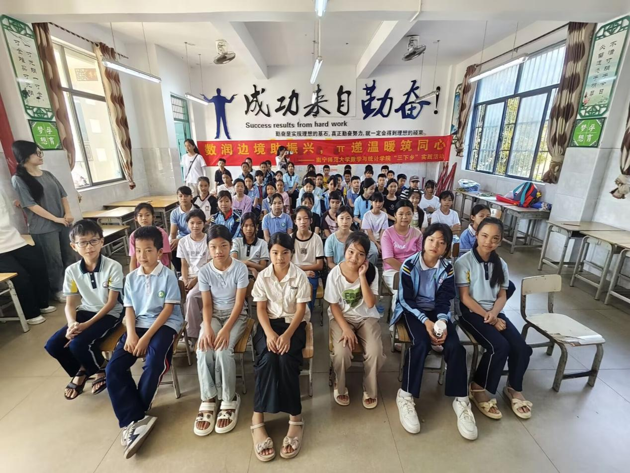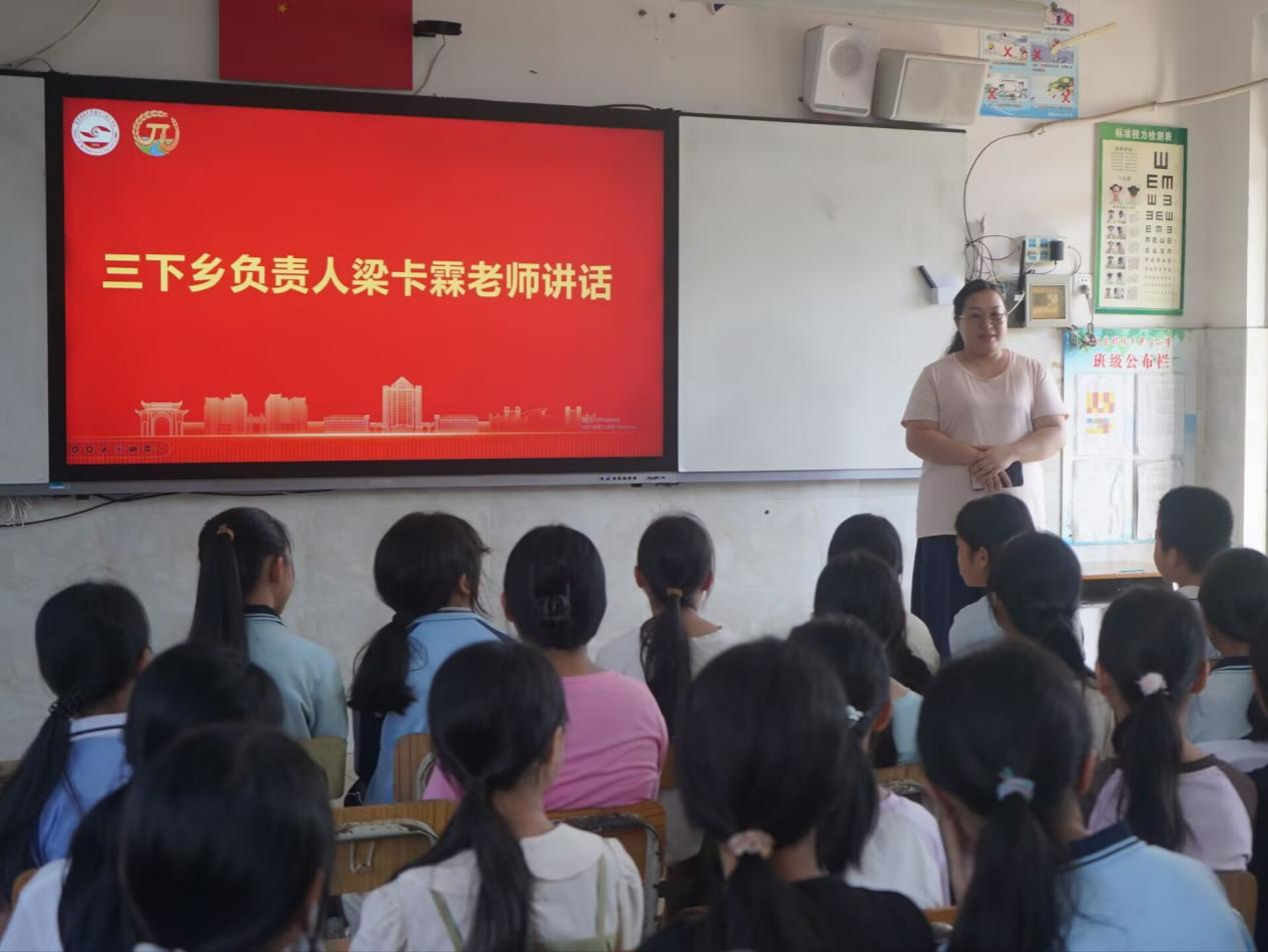 开班仪式上,实践队员们通过生动的自我介绍拉近距离,并播放南宁师范大学校园文化视频,让小学生们直观感受大学的学术氛围与青春活力,在心中播下“逐梦大学”的种子。带队老师梁卡霖详细介绍了活动安排:本次实践围绕“卫国戍边”的主题,通过“七彩课堂”、趣味运动会、文艺汇演、理论宣讲等形式,为小学生们讲授有趣的数学知识、边境安全常识,红色经典知识,助力小学生们在轻松的氛围中实现全面发展。
