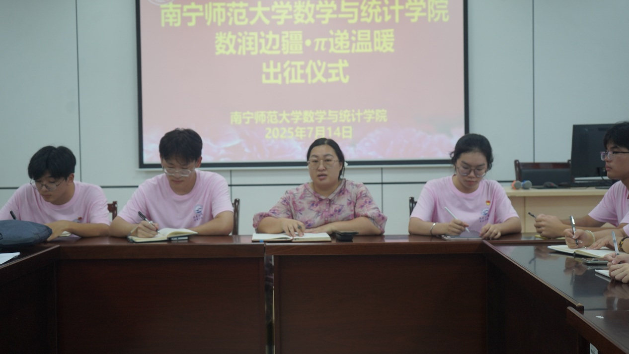随后,实践服务队指导老师梁卡霖为团队作出征寄语。她公布本次“三下乡”项目申请情况,并提出“更好的保障就要有更高的标准,要实打实做出业绩”。她还反复强调“三下乡”志愿服务期间的安全事项及注意事项,同时希望实践队员们能在活动中充分展示团队凝聚力,真正有所收获,有所成长。她提出两点期望:第一,队员们要厚植家国情怀,感悟戍边初心,让青春在为国奉献中绽放光彩。第二,队员们要发挥专业优势,传递温暖力量。结合数学与统计专业特色,为边境学校开设趣味数学课堂,让“数字暖流”真正浸润边疆大地。
